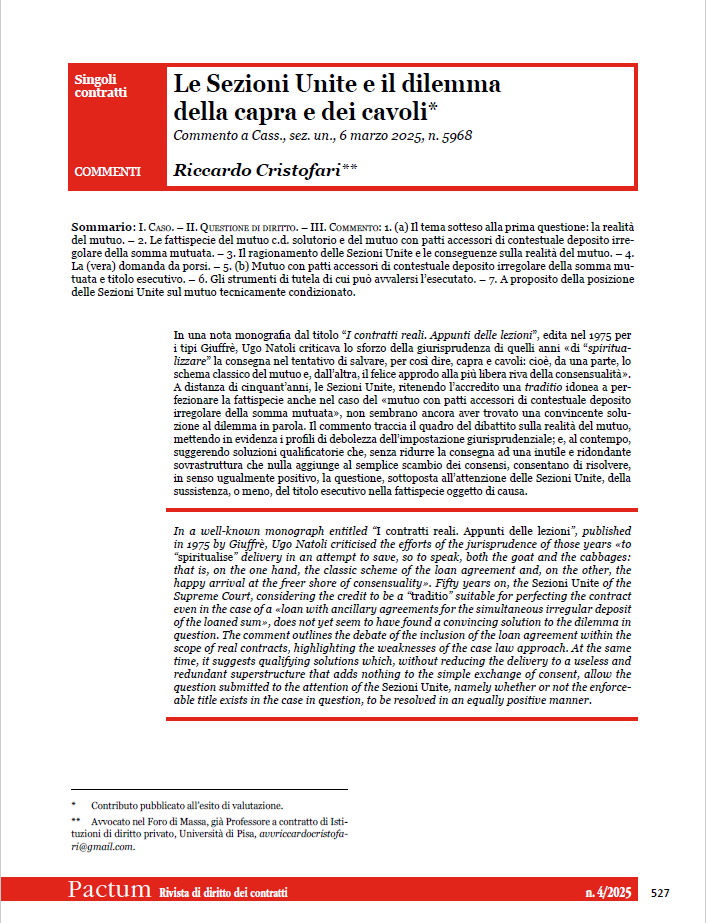 – R. Cristofari, Le Sezioni Unite e il dilemma della capra e dei cavoli, in Pactum, Rivista di diritto dei contratti, Pacini giuridica, 4/2025, 527 ss.
